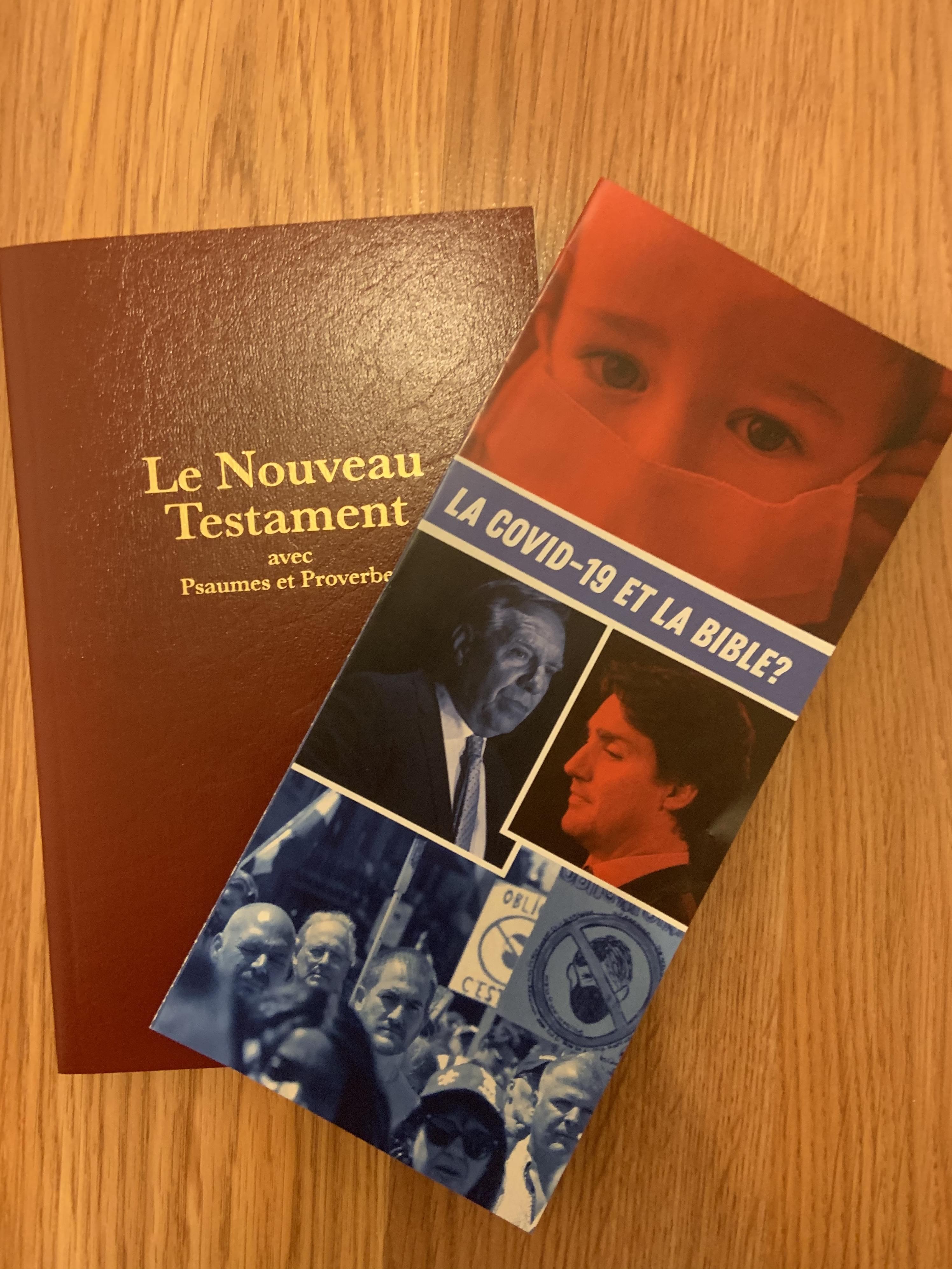 un Nouveau Testament et un dépliant explicatif sur la COVID-19.